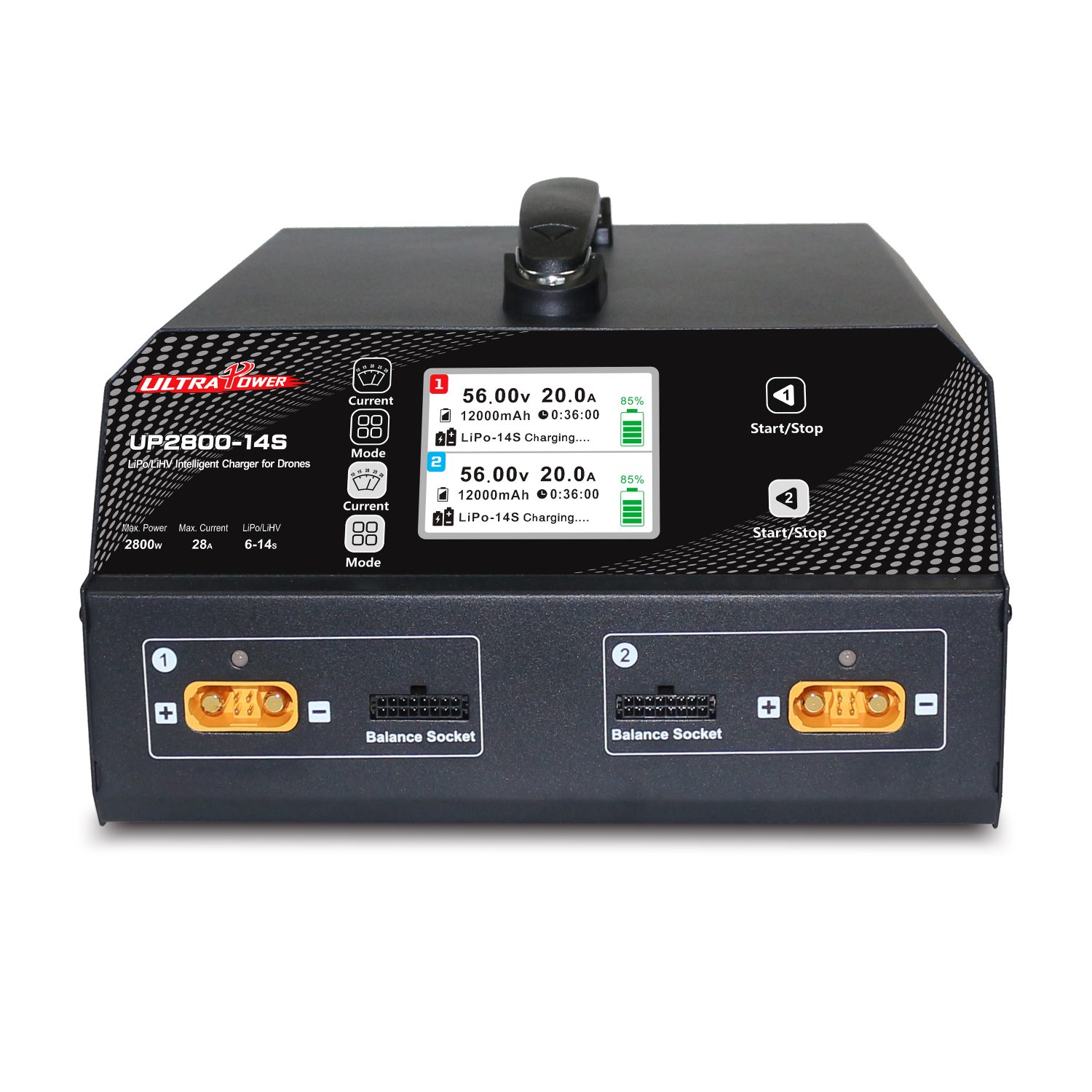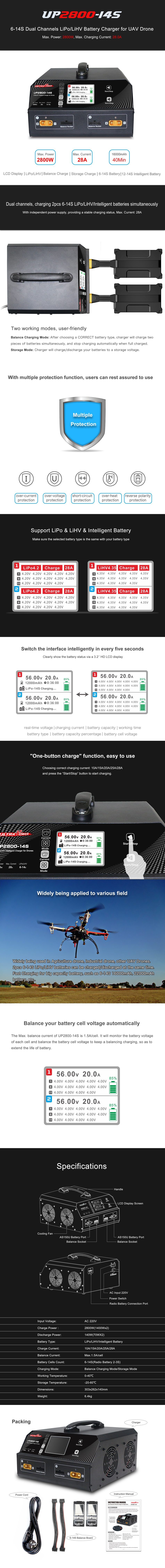 UP2800-14S 这款专业双通道电池充电器支持锂聚合物(LiPo)/ 高压锂聚合物(LiHV)电池以及电芯数量为 6-14S 的智能电池(也兼容 2-3S 的无线电电池)。它的总充电功率为 2800 瓦(1400 瓦 ×2),放电功率为 140 瓦(70 瓦 ×2),充电电流可调节(10A/15A/20A/25A/28A),每节电芯的最大平衡电流为 1.5A。该充电器具备平衡充电和存储模式,输入为交流 220V,尺寸为 303×262×140 毫米,净重 6.4 千克。其工作温度范围为 0-40°C,存储温度范围为 - 20-60°C,非常适合专业遥控设备和工业电池管理使用。
