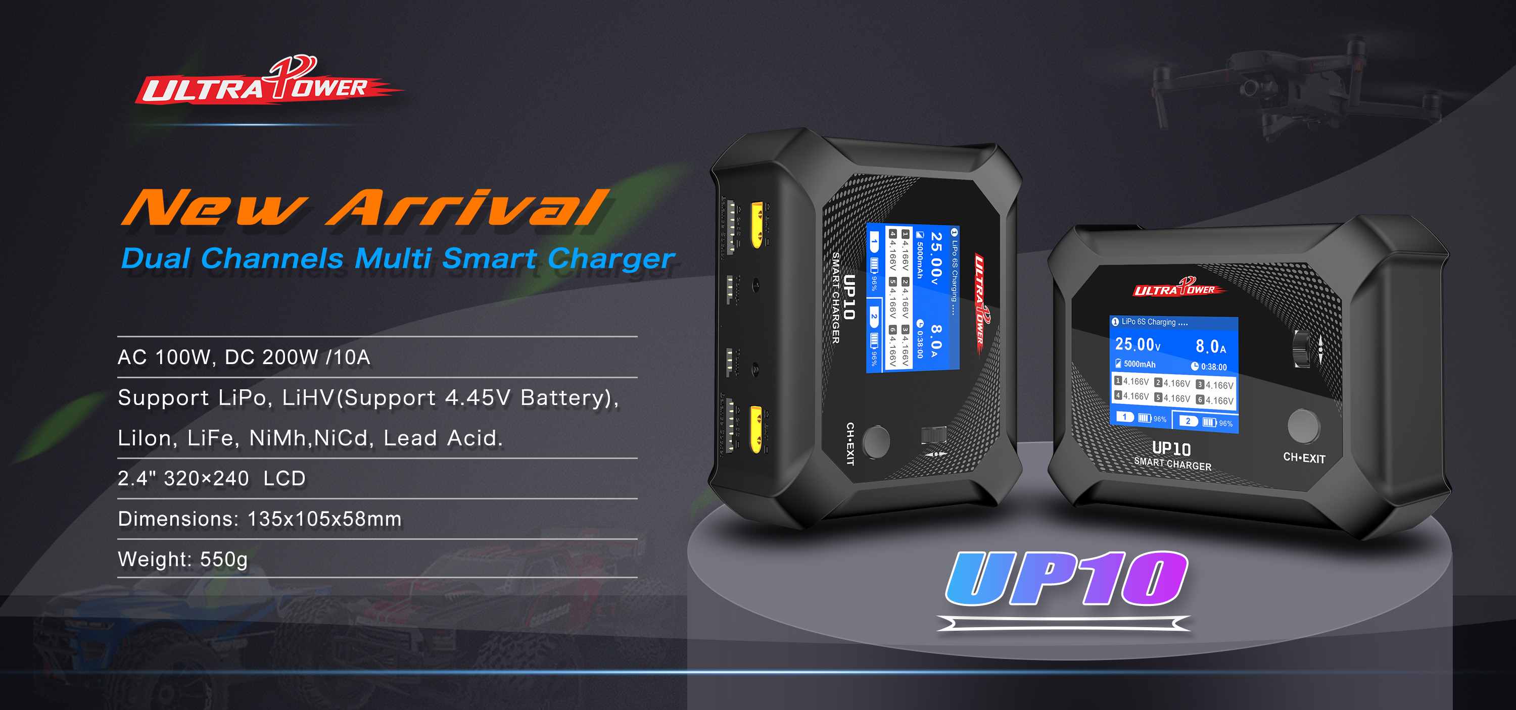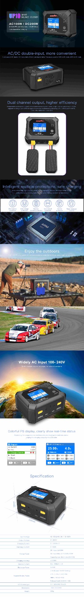 UP10 This professional dual-channel battery charger supports LiHv (4.45V), LiPo, LiFe, Li-ion (1-6S), NiMH, NiCd (1-16S), and Lead Acid (2V-24V, 1-12S) batteries. It features an input voltage range of 100-240V AC or 11.0-18.0V DC, an output voltage of 0.1-26.1V, adjustable charge current of 0.1-10.0A x2, and discharge current of 0.1-5.0A. The charger delivers a maximum charge power of 2x100W (DC) or 100W (AC) with power distribution, and a max 500mA balance current per cell. It has a charging precision of <0.005V, 2x10W discharge power, a 2.4" 320x240 IPS LCD display, dimensions of 135x105x58mm, and a net weight of 550g, ideal for professional RC and industrial battery management.