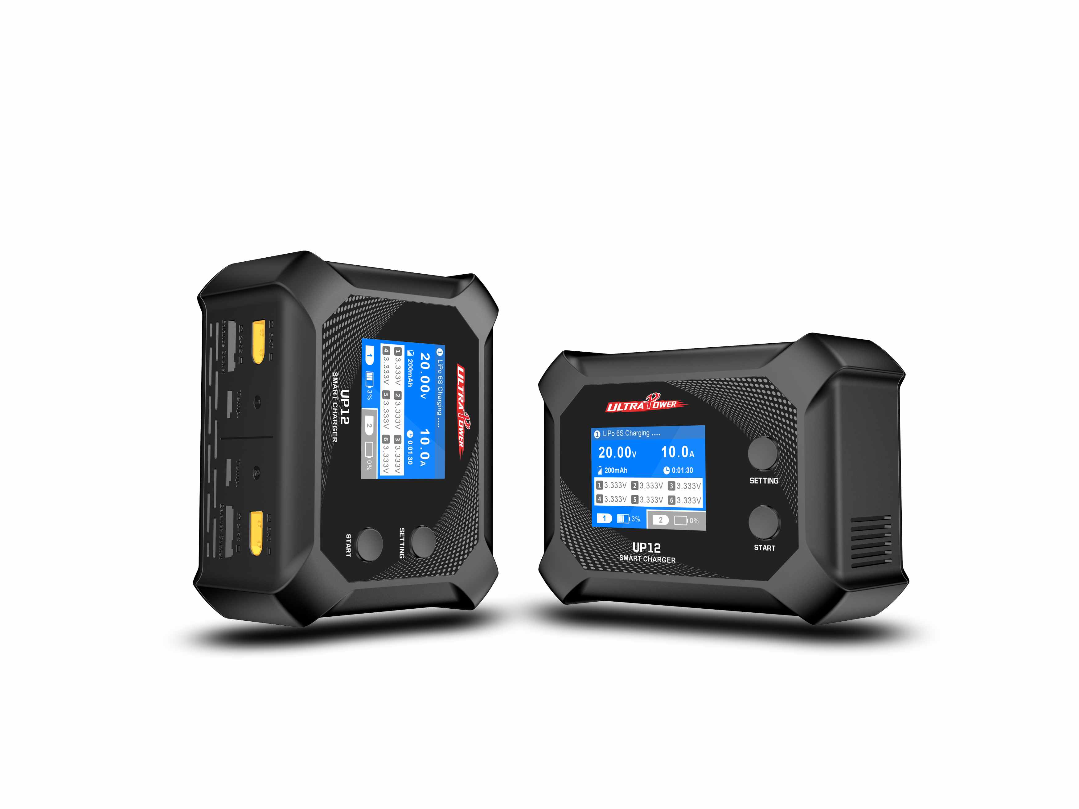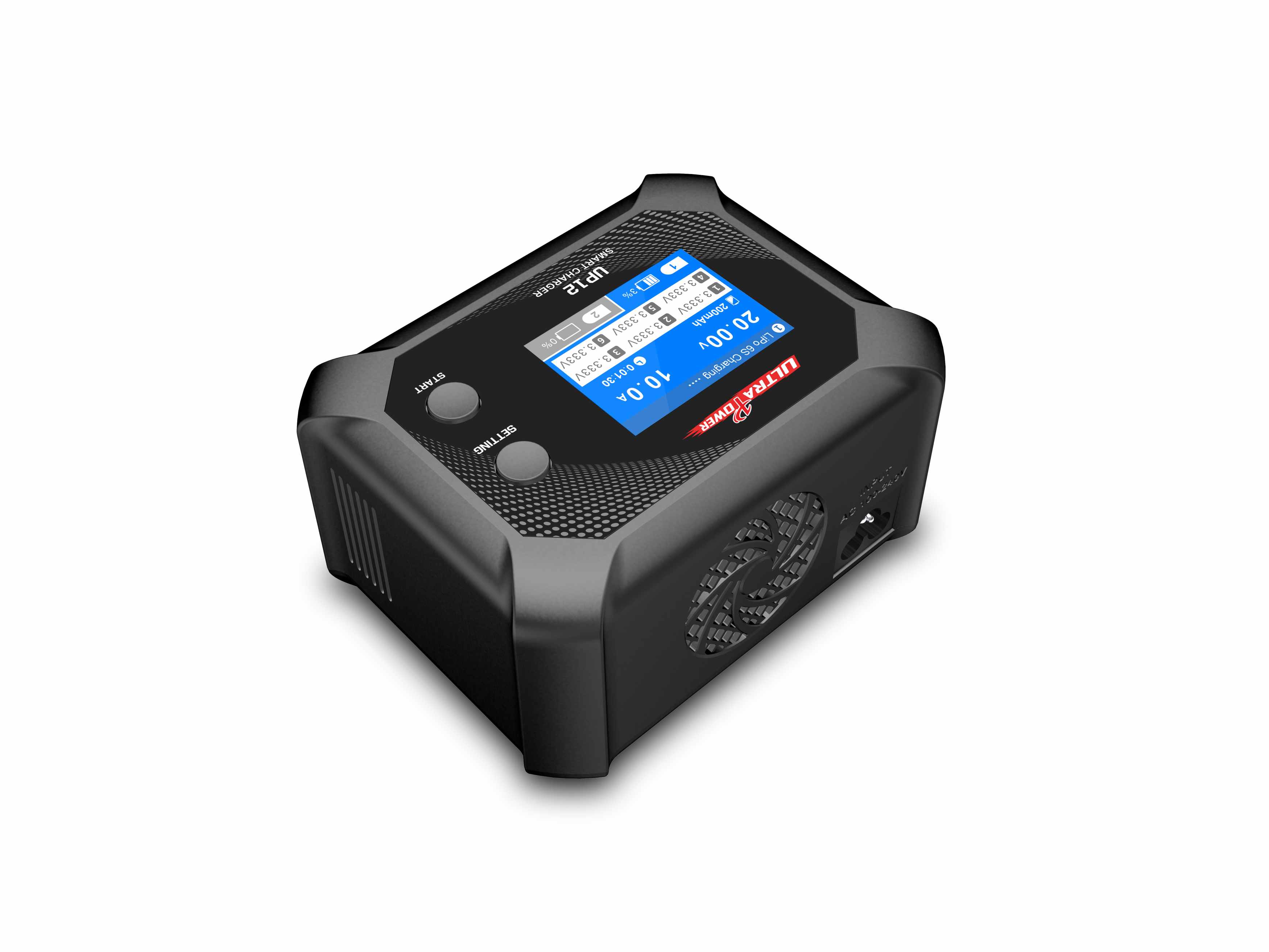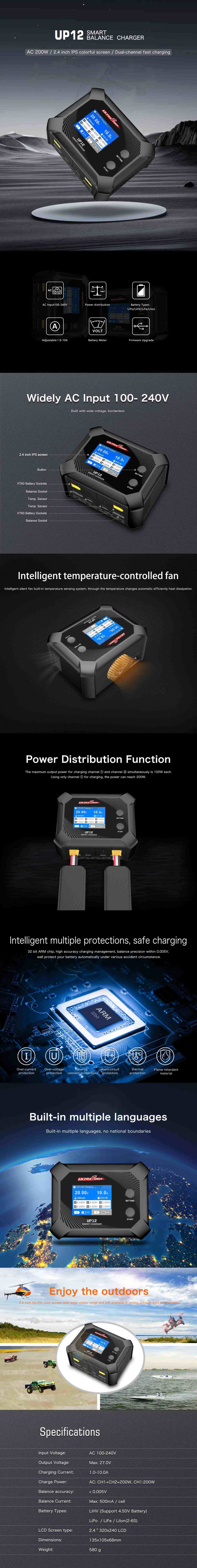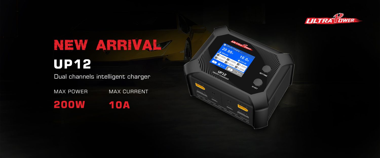 UP12 This professional dual-channel battery charger supports LiHV (4.50V), LiPo, LiFe, and Li-ion batteries with 2-6S cell count. It features an input voltage of 100-240V AC, a maximum output voltage of 27.0V, and adjustable charge current from 1.0A to 10.0A. The charger delivers a maximum charge power of 200W per channel (CH1+CH2=200W or CH1=200W), with a balance accuracy of <0.005V and a maximum balance current of 500mA per cell. It has a 2.4" 320x240 LCD display, dimensions of 135x105x68mm, and a net weight of 580g, ideal for professional RC and industrial battery management.
