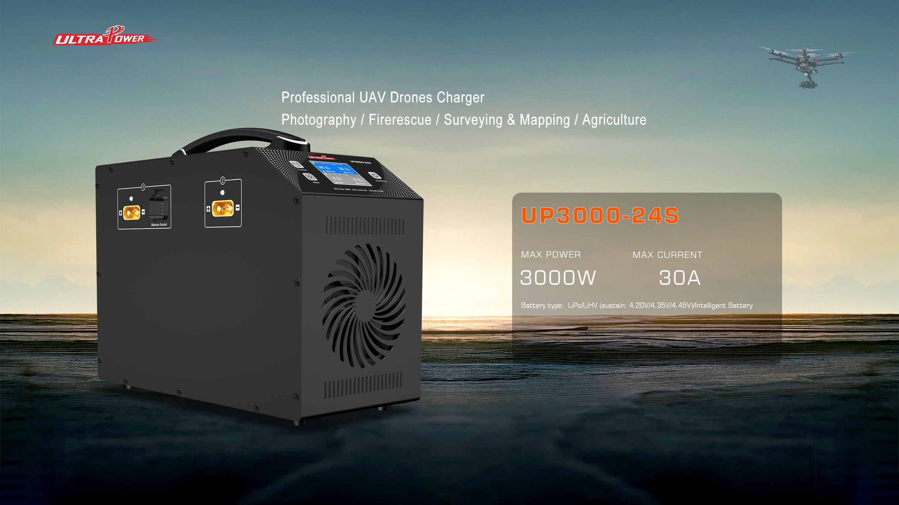 UP3000-24S This professional battery charger supports LiPo4.20V, LiHV4.35V, LiHV4.40V, LiHV4.45V, and intelligent batteries with 16-24S cell count. It delivers up to 3000W charge power at 220V (1500W at 110V), 200W max discharge power, and adjustable charge current (5A/10A/15A/20A/25A/30A) with a max 2.0A balance current per cell. The charger operates in Charge and Storage modes, accepts AC 100V-240V input, and has dimensions of 338x165x246mm with a net weight of 8.2kg, ideal for professional RC and industrial battery management.